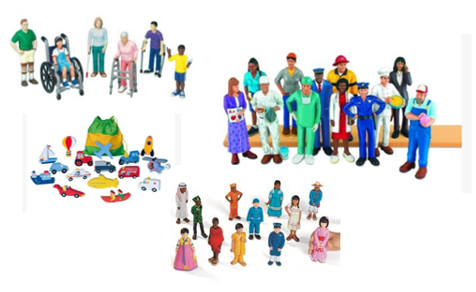 Figures to promote play and knowledge of the real world, different abilities, community figures, inclusion, diversity and transport.