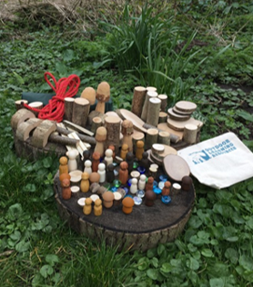 Outdoor Learning Resources cotton tote bag with various wood chunks, discs, strips, mushrooms and curves. Glass pebbles, multi ethnic wood play people, play mat and rope. The kit is versatile, promotes diversity and offers fantastic opportunities for open ended, self directed play for a wide range of ages. 110 peices.
