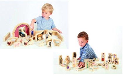 Wooden shapes depicting real world community figures, inclusion, farm vehicles and animals.