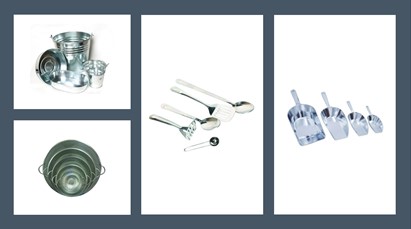 Shiny untensils, galvanised containers, metal scoops and colanders that are hard wearing, durable and fit to last. Ideal for mixing, creating and transporting water, sand or mud.